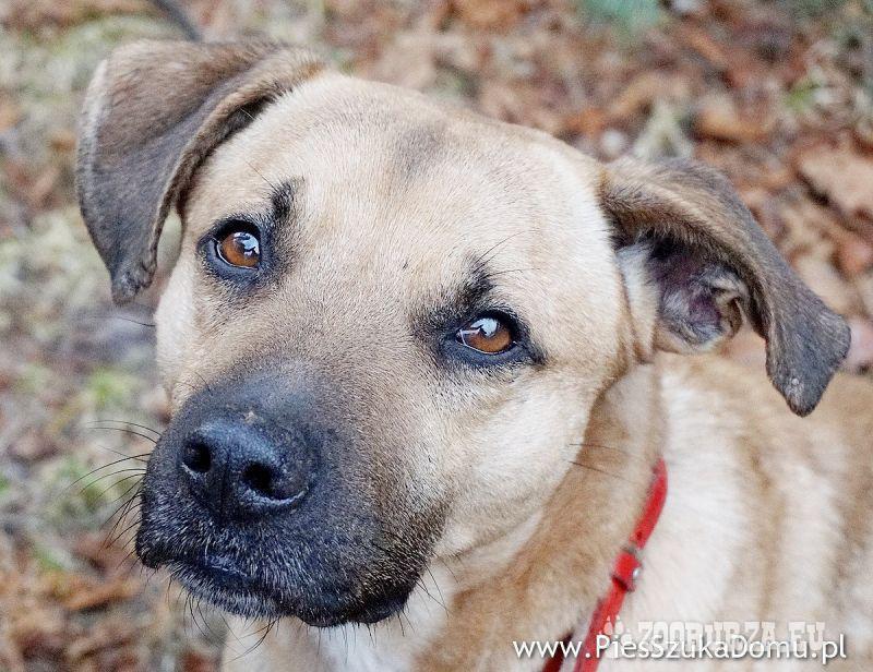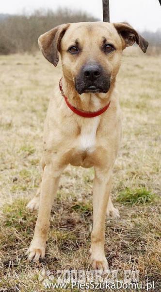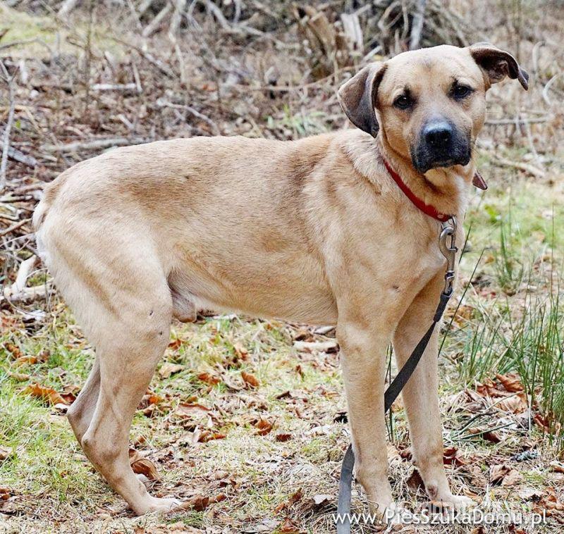 Opis: Przedstawiamy Colina. Colin to sympatyczny psiak w wieku ok. 2 lat., biszkoptowym umaszczeniu, wielkością i posturą zbliżony jest do boksera. Trafił do nas wystraszony i zahukany. Na lewym boku miał paskudną ranę, która już ładnie się wygoiła i została niewielka blizna. Ale złe czasy już minęły. Teraz Colin otwarty na ludzi czeka na swojego nowego Pana. Colin to grzeczny pies, bardzo lgnie do człowieka, uwielbia spacery, ładnie chodzi na smyczy, nie ciągnie. Jest spokojny i opanowany, ... no chyba, że zobaczy stado naszych kóz ... wtedy szczeka i widać, że chciałby się z nimi "pobawić" (Jeżeli macie kozy lub inne kopytne to nie polecamy Pomóżmy znaleźć nowy dom dla Colina