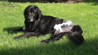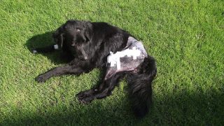 Opis: Czarny jest mieszanką nowofundlanda. Został znaleziony po wypadku. Obecnie Czarny dochodzi już do sił, łapa pięknie się zrasta - czeka go jedynie wyciągnięcie śrub. Jest to bardzo łagodny, subtelny i przytulaśny pies. Dzielnie znosi wszystkie zabiegi pielęgnacyjne. Jest bardzo usłuchany, żyje w zgodzie ze wszystkimi żywymi istotami, na koty nie zwraca uwagi, z psami się dogaduje, lubi dzieci. Nie jest typem psa stróżującego, który biega i pilnuje. Najchętniej spędza czas w pobliżu człowieka, by choć fragmentem ciała być do niego przytulonym. Bez problemu zostaje sam na parę godzin, ale najważniejszy jest dla niego czas spędzony z człowiekiem, cały czas chodzi koło nogi