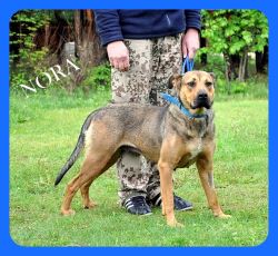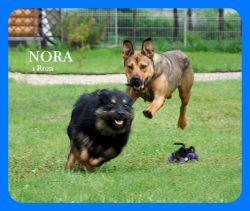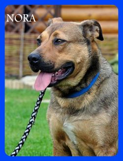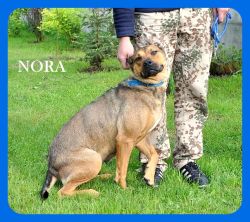 Opis: Nora to młodziutka, gładkowłosa suczka. Jest wielkości mniej więcej owczarka niemieckiego. Waży około 30 kg. Jest zdrowa ,odrobaczona, odpchlona i WYSTERYLIZOWANA. Jest karna, reaguje na podstawowe komendy. Umie chodzić na smyczy. Na spacerach skoncentrowana na człowieku i otoczeniu, nie reaguje na inne psy. Bardzo spragniona kontaktu z człowiekiem, chce być blisko, lubi gdy się ją głaszcze i przytula. Ma wspaniały charakter, jest łagodna przyjacielska i uległa. Dobrze dogaduje się z innymi psami, choć w zabawach nie jest zbytnio delikatna, więc jej ewentualny psi towarzysz nie może być malutkim, delikatnym pieskiem. Nie toleruje kotów.