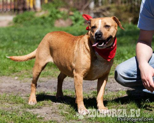 Opis: MARGO to ok. 5-letnia wysterylizowana suczka, waży 20 kg. Nie wiadomo czy się komuś zgubiła czy została porzucona. Jako psiak bezdomny trafiła do schroniska i tam przesiedziała 2 lata z łatką "pies w typie amstaffa, czyli na pewno agresywny". Osowiała siedziała całymi dniami w budzie, nie szukała kontaktu z człowiekiem, sprawiała wrażenie wycofanej budząc tym bardziej lęk zainteresowanych adopcją. W końcu dostała szansę, opuściła schroniskowe mury i obecnie mieszka w psim hoteliku, gdzie czeka na dom. Nie jest już smutnym, zalęknionym psiakiem. Okazało się, że to wspaniała przyjacielska sunia bez żadnych lęków.