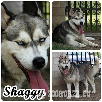 Opis: Shaggy jest kilkuletnim przedstawicielem rasy Siberian husky, o błękitnych oczach oraz wilczastym umaszczeniu. Pies mimo swojej wielkości zachowuje się jak kilkumiesięczny uroczy, słodki szczeniaczek, uwielbia głaskanie, pieszczoty, przybiega do człowieka od razu jak się go zawoła i wystawia brzuszek do drapania. Bardzo łaknie kontaktu z człowiekiem, chętnie się bawi i uczy komend, każda aktywność z ludźmi sprawia mu wielką radość. Shaggy jest bardzo posłuszny i karny co jest rzadko spotykane u tej rasy psów, bardzo potrzebuje uwagi, akceptacji i miłości człowieka. Widząc go i jego zachowanie można skwitować psiaka krótkim stwierdzeniem: „zrobię dla Ciebie wszystko tylko mnie kochaj”. Pies