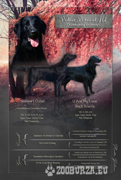 Opis: Miło nam poinformować, że w naszej hodowli „Polka Poland FCI" zrzeszonej w ZKwP 26.12 2018 z radością powitaliśmy na świecie czarne flaciki.Matką została nasza Gapa, czyli U ARE MY LOVE BLACK BRIANTA, suczka sprowadzona z Czech, doskonale pracująca terapeutka, posiadająca certyfikat psa terapeuty, wystawiony przez Fundację Ama Canem. Wolna od dysplazji HD A , ED 0/0 , jak również chorób oczu łącznie z gonio – wolna. Ojciec szczeniąt, przystojny brunet urodzony w Wielkiej Brytanii, a mieszkający w Polsce Seaheart CONALL Młodzieżowy Champion Polski, z kompletem badań : HD-A, ED-0/0 , PL-0/0, oczy czyste + gonio wolny. Conall to certyfikowany pies terapeuta. Zapraszamy na Facebook
