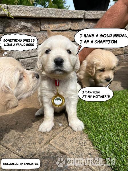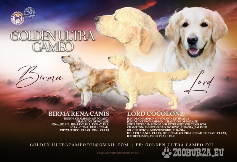 Opis: Rodzicami tych szczeniąt są wielokrotni Championi , w tym Championi Międzynarodowi. Obydwoje są w doskonałym zdrowiu w wieku 3 lat, co jest idealnym wiekiem do hodowli. Ukończyli wszystkie odpowiednie testy genetyczne, a także ocenę stawów łokciowych i biodrowych — wszystkie wyniki są dostępne na życzenie dla poważnie zainteresowanych . Szczenięta będą dostępne od 8 tygodnia życia. Jesteśmy domową hodowlą położoną w Górach Świętokrzyskich około 15 km od Kielc dlatego nasze psy mają pod dostatkiem pola łąki lasy co gwarantuje im wyśmienitą kondycję , a zarazem częste wycieczki do Kielc w tym do galerii handlowych dają im obycie z miejskim środowiskiem. Zapraszamy Golden Ultra Cameo FCI