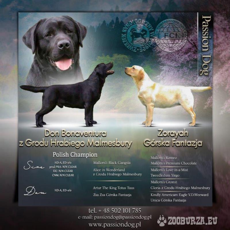 Opis: Hodowla Psów Rasowych Passion Dog poleca 2 czarnych chłopaków w opcji „na kolanka” urodzonych 30.03.2021 r. W miocie było 6 szczeniąt - 3 chłopaków i 3 suczki. Ich rodzice mają wspaniałe pochodzenie i wybitne osiągnięcia wystawowe. Ojcem jest CH.PL. DON BONAVENTURA z Grodu Hrabiego Malmesbury a mamą nasza przecudowna ZORAYAH Górska Fantazja. Rodzice całkowicie wolni od dysplazji stawów biodrowych i łokciowych, z przebadanymi oczami by ich dzieci nie zachorowały na postępujący zanik siatkówki. Dodatkowo rodzice całkowicie wolni od skłonności do zapaści wysiłkowej i miopatii. Zapraszamy do zakupu szczeniąt, które do odbioru będą od 27.05.2021