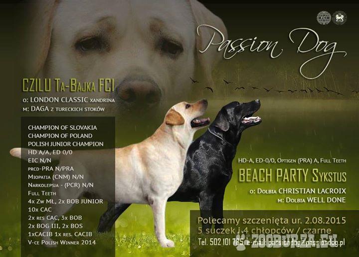 Opis: Hodowla Psów Rasowych Passion Dog poleca śliczne czarne szczenięta labradora. Rodzice szczeniąt z wspaniałym pochodzeniem i osiągnięciami wystawowymi. W dniu 02.084.2015 nasza sunia BEACH PARTY Sykstus urodziła 5 dziewczynek i 4 chłopaków . Ojcem szczeniąt został Mł.Ch.Pl, Ch.Pl i Ch.SK CZILU Ta BAjka. Rodzice szczeniąt całkowicie wolni od dysplazji stawów biodrowych i łokciowych, z przebadanymi oczami by szczeniaczki nie zachorowały na postępujący zanik siatkówki. Dodatkowo rodzice całkowicie wolni od skłonności do zapaści wysiłkowej i miopatii. Zapraszamy do rezerwacji szczeniąt, które w chwili odbioru będą zaszczepione i trzykrotnie odrobaczone. Szczenięta z metrykami ZKwP o/Kielce