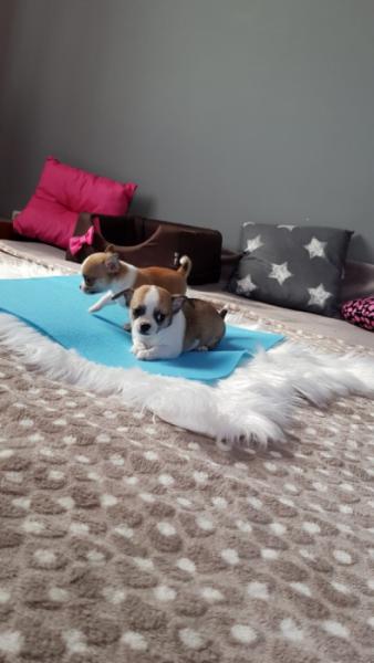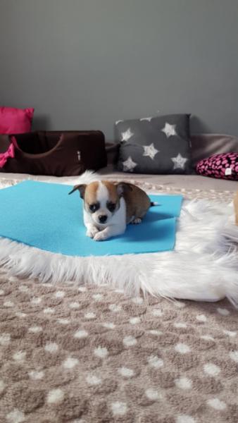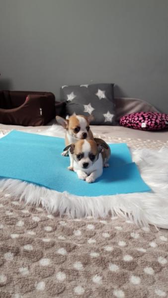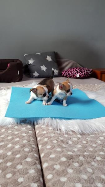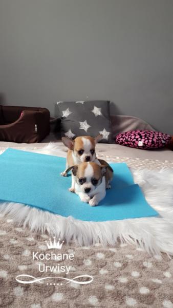 Opis: Witam. Mam do zaoferowania dwa pieski Chihuahua. Pociechy są wyjątkowo żywotne oraz uwielbiają się bawić. Mają jabłkowate glówki oraz krótkie kufy, są przepięknie umaszczone. Pieski idealne do zabaw z dziećmi oraz spacery. Posiadają rodowody wielopokoleniowe. W dniu odbioru będą posiadały komplet szczepień, książeczkę zdrowia oraz chip. Pociechy mają po 5 tygodni, w dniu odbioru otrzymają Państwo również wyprawkę, która ułatwi naszym maluszkom start w nowej rodzinie. Nasza hodowla to Kochane Urwisy - SWKiPR