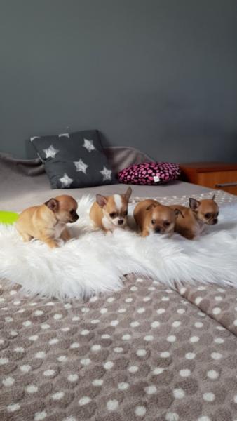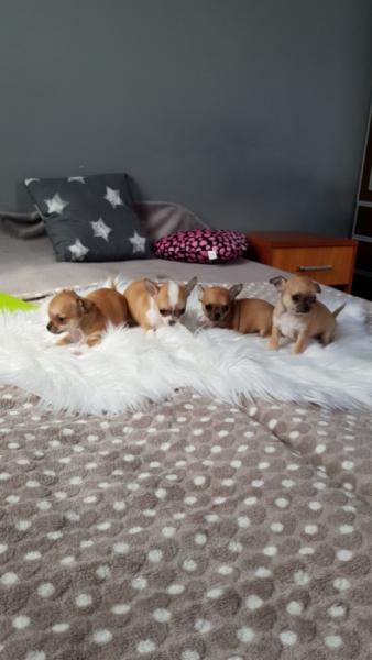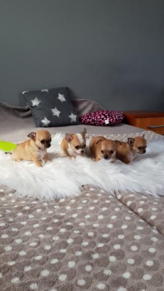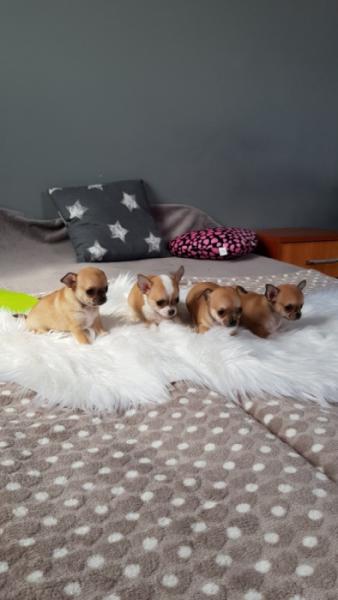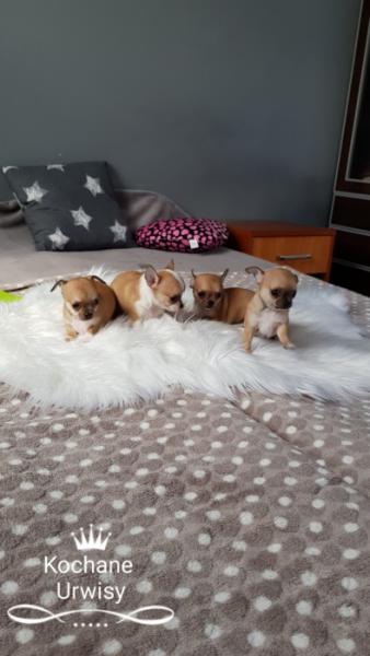 Opis: Witam Państwa. Oferuję przepiękne sunie Chihuahua z domowej hodowli Kochane Urwisy - SKWiPR Sunie mają jabłkowate główki oraz krótkie kufy. Są prawidłowo zbudowane, bardzo energiczne oraz żywotne. Bardzo lubią się bawić i są idealne do zabaw z dziećmi oraz na spacery. Posiadają rodowody wielopokoleniowe, książeczki zdrowia, komplety szczepień oraz są zachipowane, mają 7 tygodni. W dniu odbioru otrzymają Państwo wyprawkę ułatwiającą maluszkowi start w nowej rodzinie.