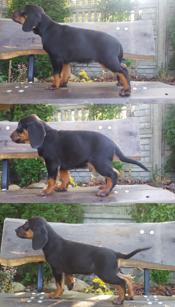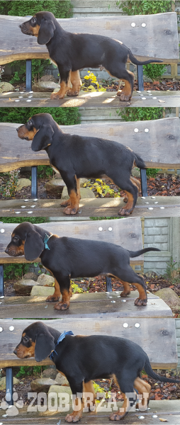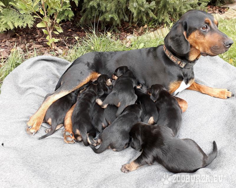 Opis: W dniu 23 sierpnia 2017 roku w hodowli Z Dębowego Zakątka FCI przyszły na świat szczeniaki rasy Gończy Polski. Urodziły się 3 suczki i 6 psów. Matka: ZETKA z Nadnarwiańskich Mgieł FCI po Hultaj Cnotliwy Nos i Bora z Elklandu brązowa medalistka srebrna medalistka aktywnie polująca, będąca w rękach myśliwego dochodząca postrzałka zrównoważony charakter przebywająca z dziećmi (nie wykazuje agresji) czarna podpalana 46 cm w kłębie, 22 kg wagi Ojciec: Hunter Dziczy Łowca FCI Champion Polski ok 40 polowań zbiorowych w sezonie 2016/2017 pies cięty bardzo dobry poszuk zero agresji czarny podpalany