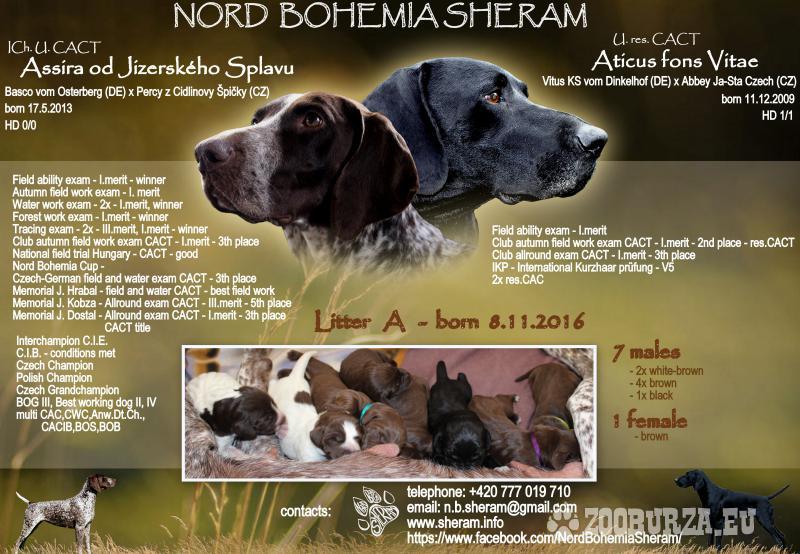 Opis: Oferujemy szczenięta urodzone 08.11. 2016. z rodowodem. Rodzice super exterier, wyjontkowi do polowania i sportow. Utytulowani - ICh, Ch PL, CZ, GrCh CZ, multi CAC, CWC,CACIB,BOS,BOB, duzo examinow - mozna zobaczyc na www.sheram.info i FB https://www.facebook.com/NordBohemiaSheram/