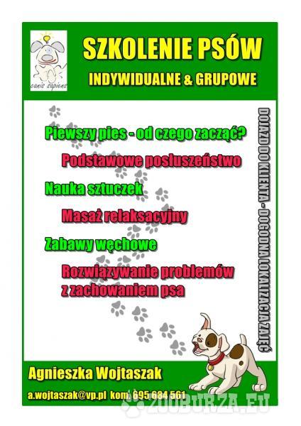Opis: SZKOŁA DLA PSÓW - CANIS SAPIENS zaprasza na szkolenia psów. Oferta kursów i obowiązujących zniżek na stronie www.szkolimy-psy.pl Na kurs przyjmujemy psy w każdym wieku poczynając od 4 miesiąca. W przypadku młodszych szczeniąt proponujemy konsultacje indywidualne w domu właściciela. Uważamy, że na naukę nigdy nie jest za późno, dlatego pracujemy również ze starszymi psami, uwzględniając w szkoleniu ich ewentualne problemy zdrowotne. ZAPRASZAMY!!!
