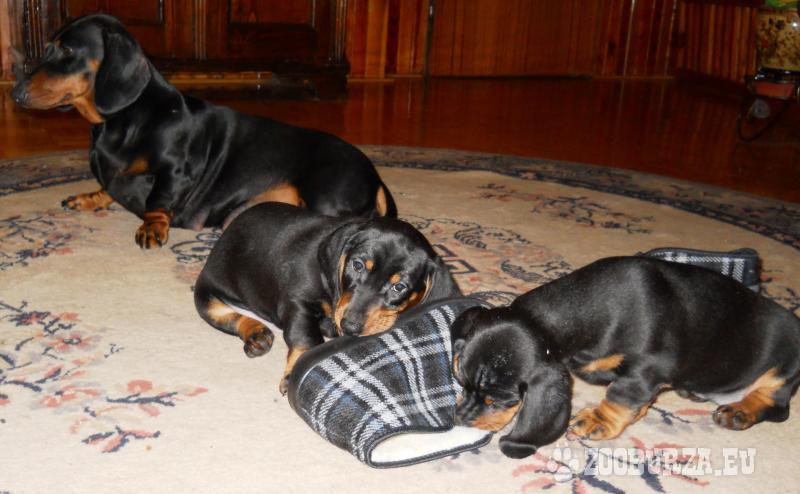 Popis: Predám šteniatka krátkosrstého čierneho páleného jazvečíka. Narodili sa 03.11.2011. Rodičia sú s PP, šteniatka bez. Sú odčervené a očkované s veterinárnym preukazom. 1 fenka, 1 psík. Odber mozný ihneď. Cena 70 Euro. Telefon 0907 86 52 51 / 0907 052 420. Okres DS